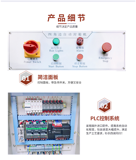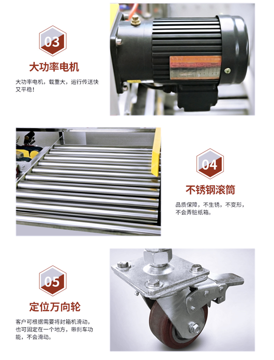 角邊封箱機紙箱經前段封箱機中間上下封口后,進入90度轉角機,由推箱板推入角邊封箱機,同時自動封紙箱上下四個角邊、撫平,快速、平穩。